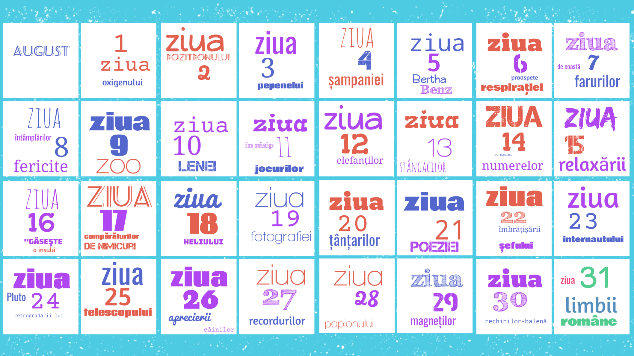 Dezvoltarea interesului pentru cunoaștere și autocunoaștere = majoritatea zilelor din calendar marchează sărbători mai neobișnuite, mai puțin cunoscute, mai amuzante, fapt care creează un prilej de a cunoaște lumea din alte perspective; mai există în calendar și zile care necesită conexiuni cu evenimentele reale din spatele lor (ex: ziua Moby Dick – ziua în care vasul Essex a fost scufundat de cașalotul de 80 de kg, eveniment care a inspirat cartea cu același nume scrisă de Herman Melville).